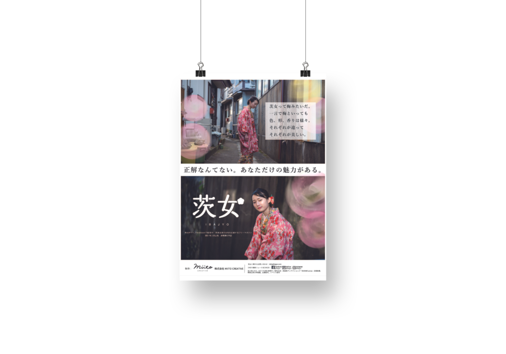スクールの課題でフリーマガジン『茨女』(茨城県出身の等身大の女性(「茨女」)を応援するフリーマガジン)の広告デザインを作成しました。1人1人が違う経験、環境、悩みを抱えながらも共通してまっすぐに前向きに向き合う茨城出身の女性と、多種多様でそれぞれ美しい花を咲かせる偕楽園の梅を連想させるようなデザインにしました。